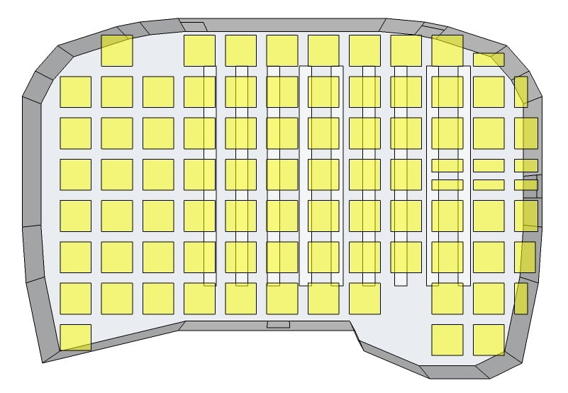 - sala łączona, kształt łamany, kubatura ok. 670 m3, powierzchnia ok. 1000 m2, pomieszczenia typu: sala łączona w pełni otwarta.