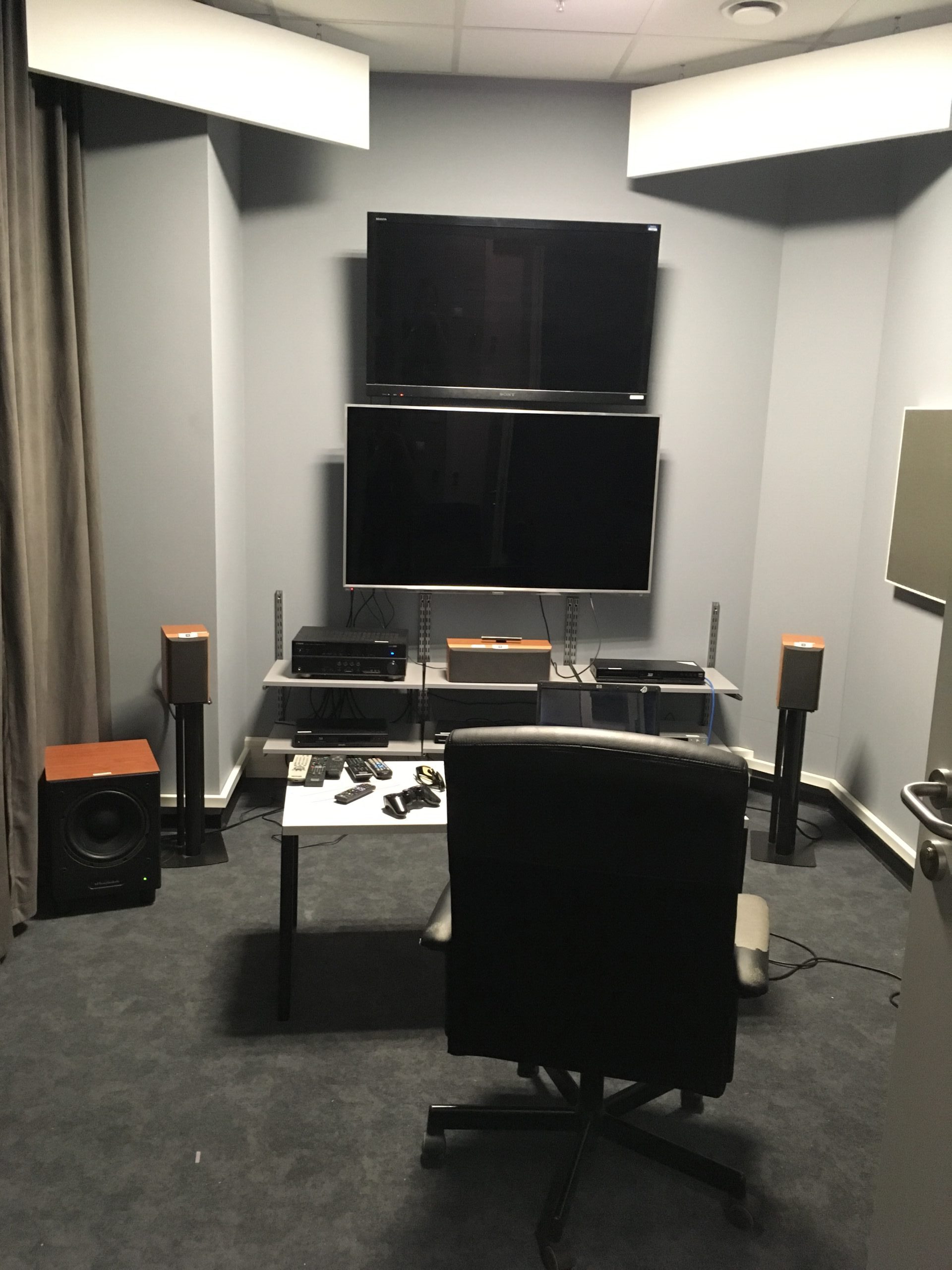 Wszystkie pomieszczenia odsłuchowe zostały przez nas zaprojektowane w taki sposób aby zminimalizować zabarwienie w zakresie niskich częstotliwości oraz zniwelować niekorzystne zjawiska np. echa trzepoczącego. Dodatkowo adaptacja akustyczna miała za zadanie w kilku pomieszczeniach na prawidłowe działanie systemu odsłuchowego Dolby Atmos, a w pozostałych na uzyskanie lepszych parametrów akustycznych.