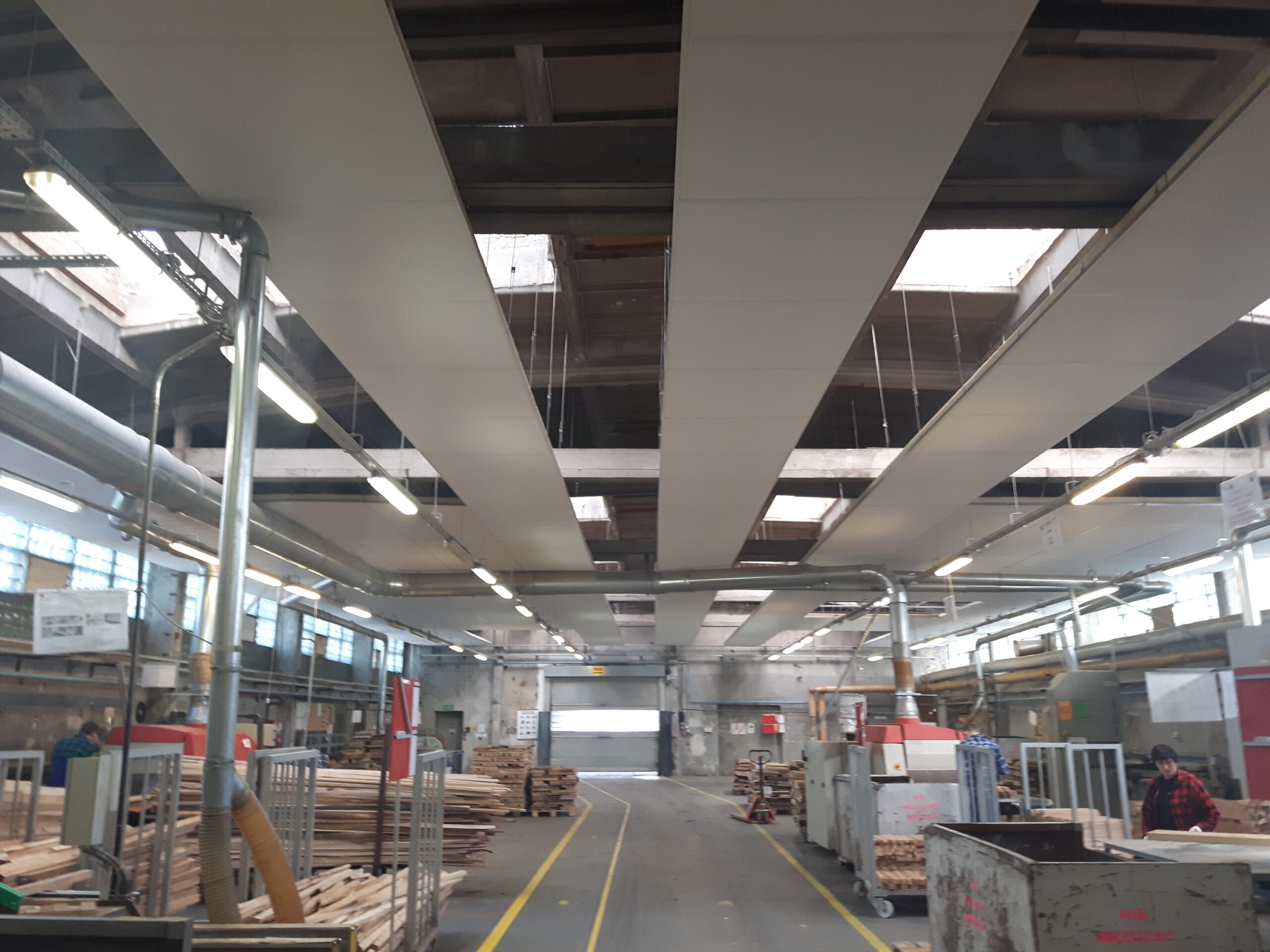 Warunki akustyczne w halach produkcyjnych ocenione z punktu widzenia obowiązujących przepisów dotyczących ochrony przed hałasem na stanowisku pracy sugerowały podjęcie działań mających na celu obniżenie hałasu. Należało go obniżyć poprzez zastosowanie paneli dźwiękochłonnych zamontowanych na powierzchni sufitowej. Biorąc pod uwagę technologię, ergonomię, oświetlenie itp. zasugerowaliśmy ustroje dźwiękochłonne w formie paneli, które zostaną zamontowane na większej części powierzchni stropu.