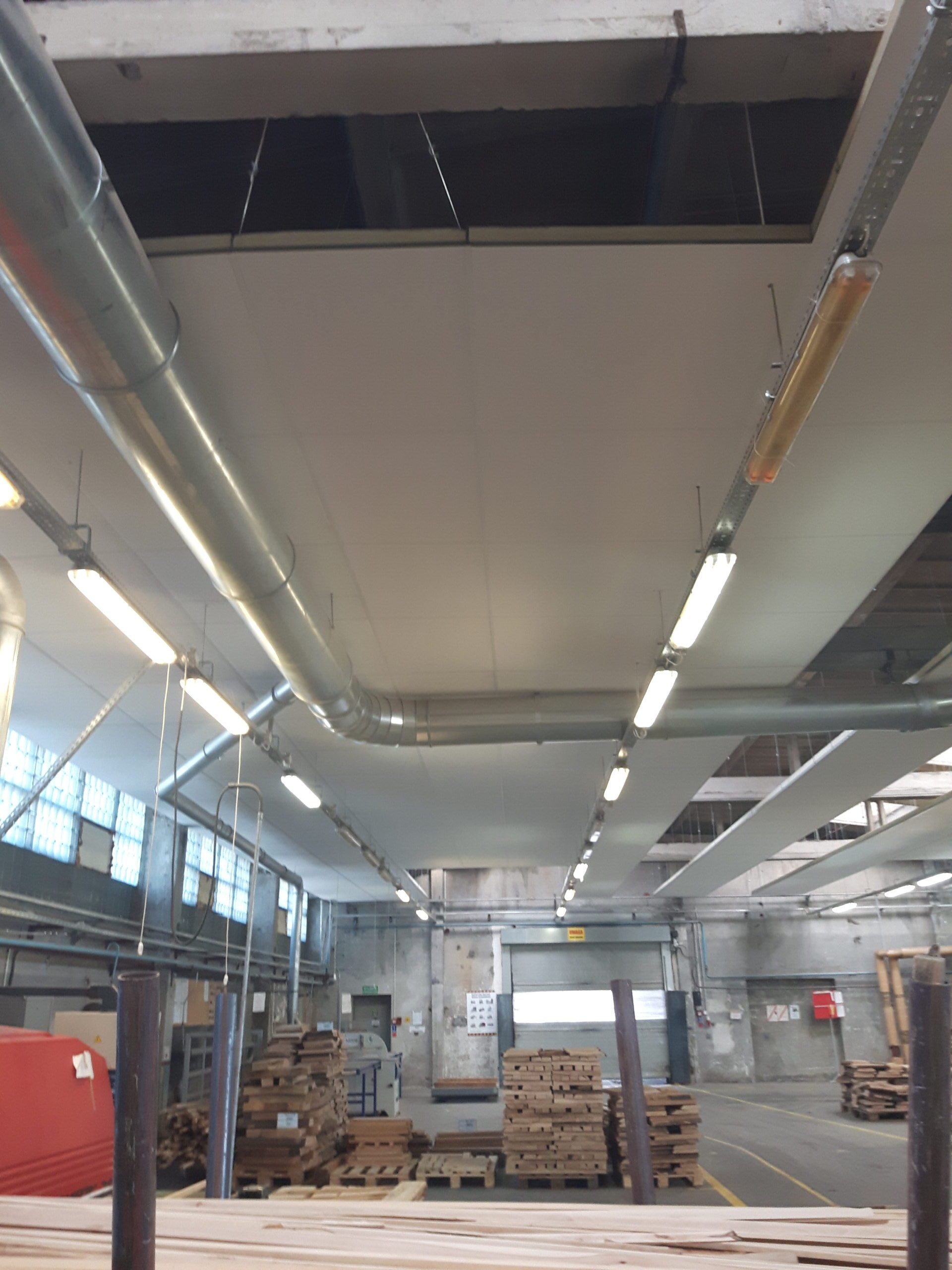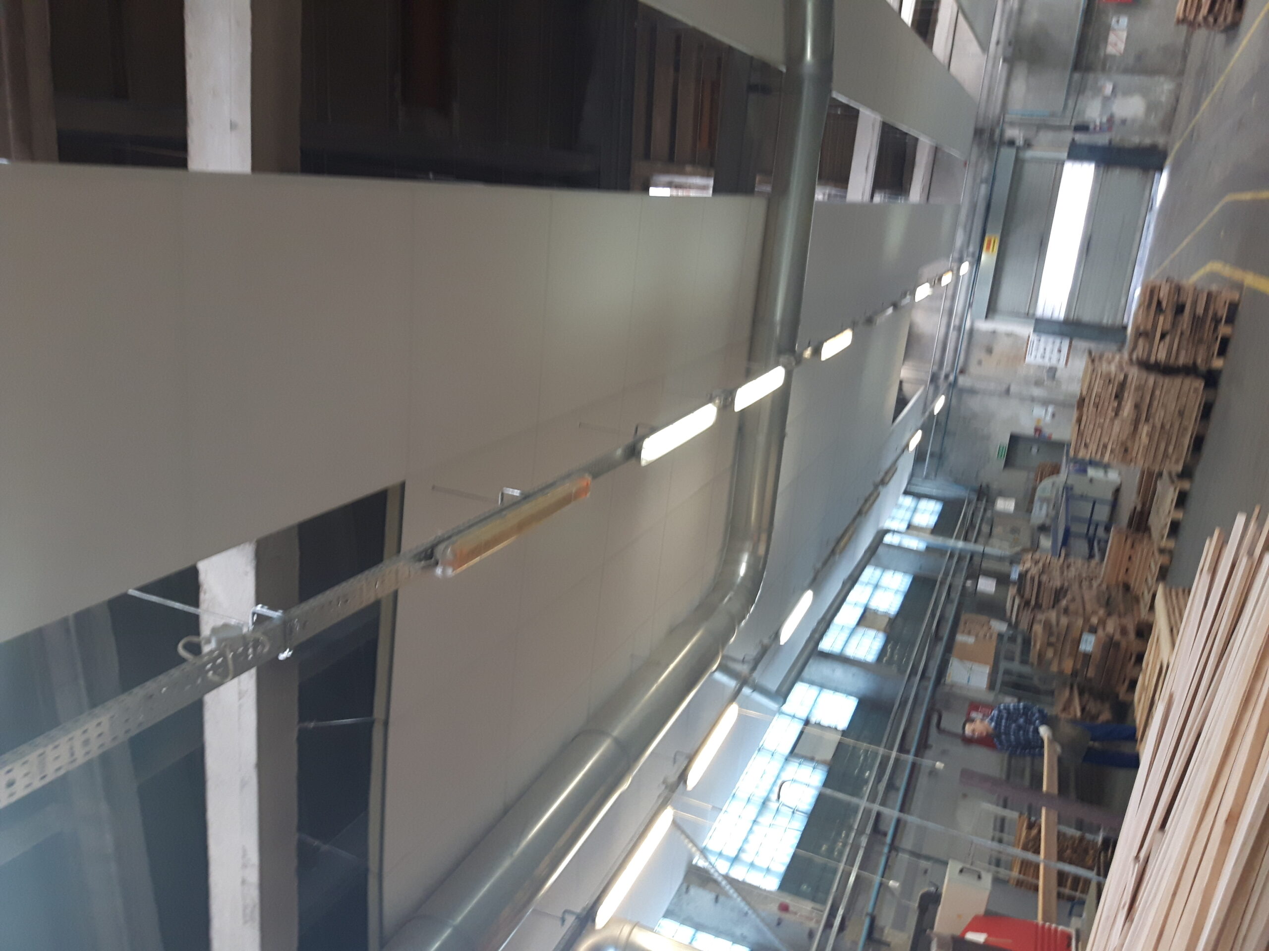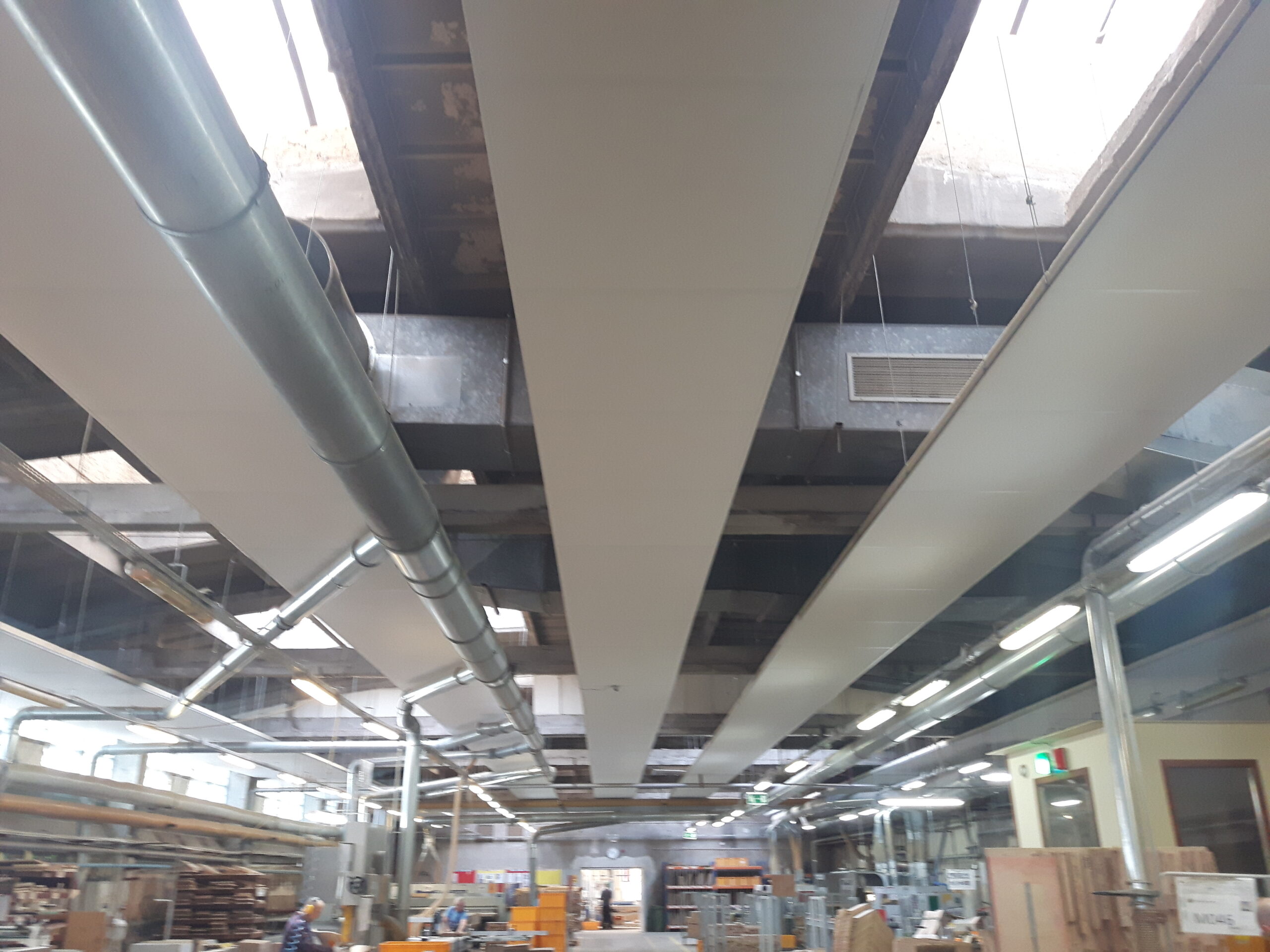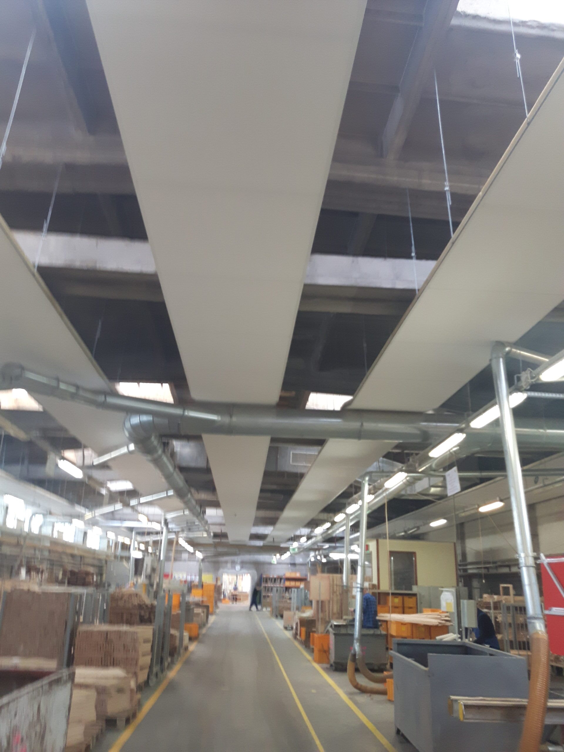 Podczas projektowania adaptacji akustycznej największej hali zastosowaliśmy nasze autorskie rozwiązanie dzięki szczegółowej analizie rozchodzenia się fal akustycznych w obrębie stanowisk pracy. Oprócz pogłosowego hałasu jaki powstawał wewnątrz hali, bardzo duży wpływ miały odbicia od całej powierzchni sufitowej. Z tego względu zaproponowaliśmy zastosowanie wiszących wysp oddalonych od siebie o określona odległość i zamontowanych na całej długości hali. Dzięki takiemu rozwiązaniu skutecznie obniżyliśmy globalny poziom hałasu o aż 9 dB!!!