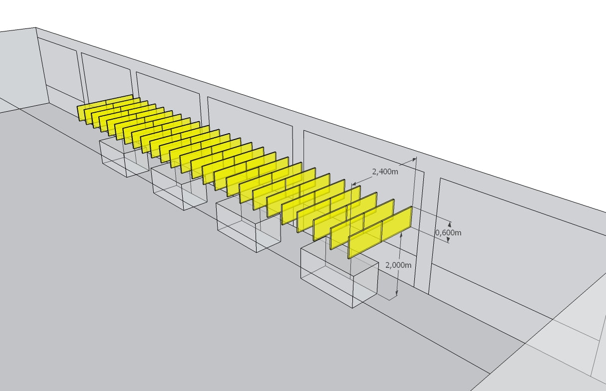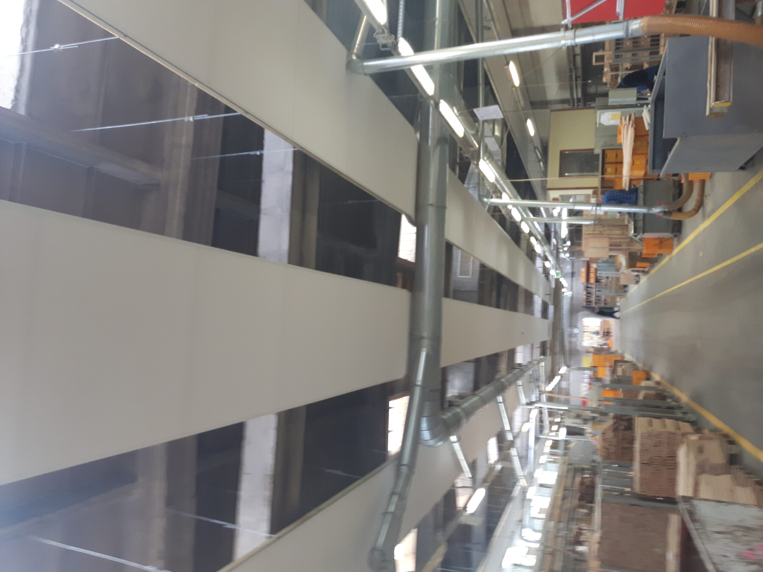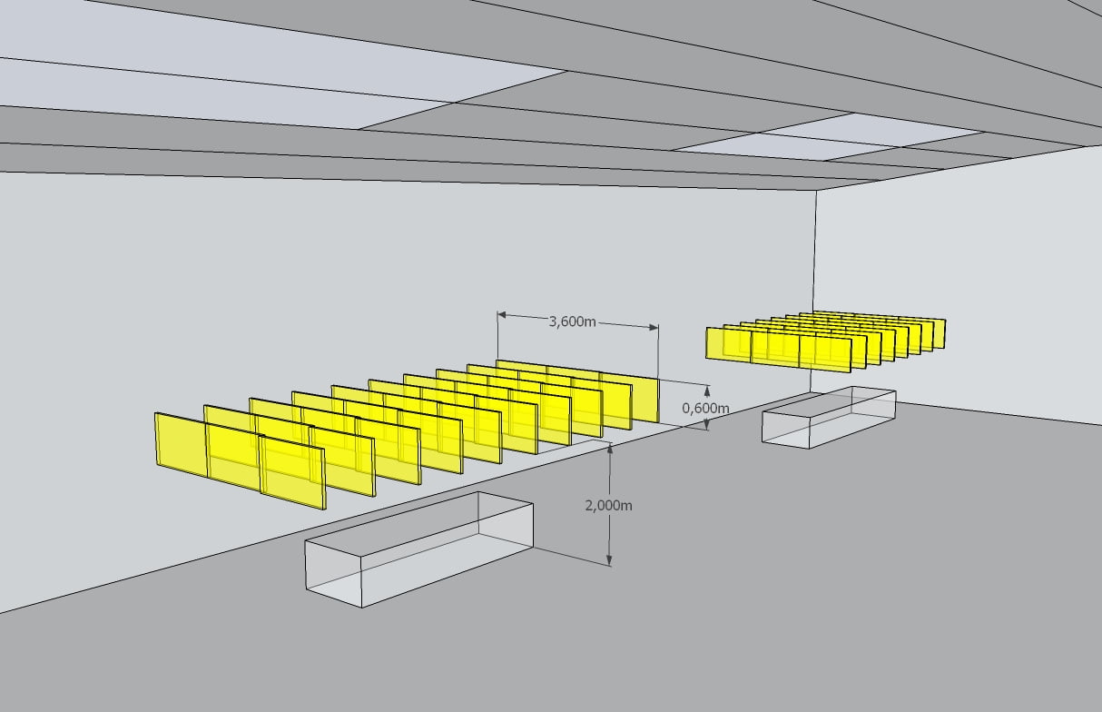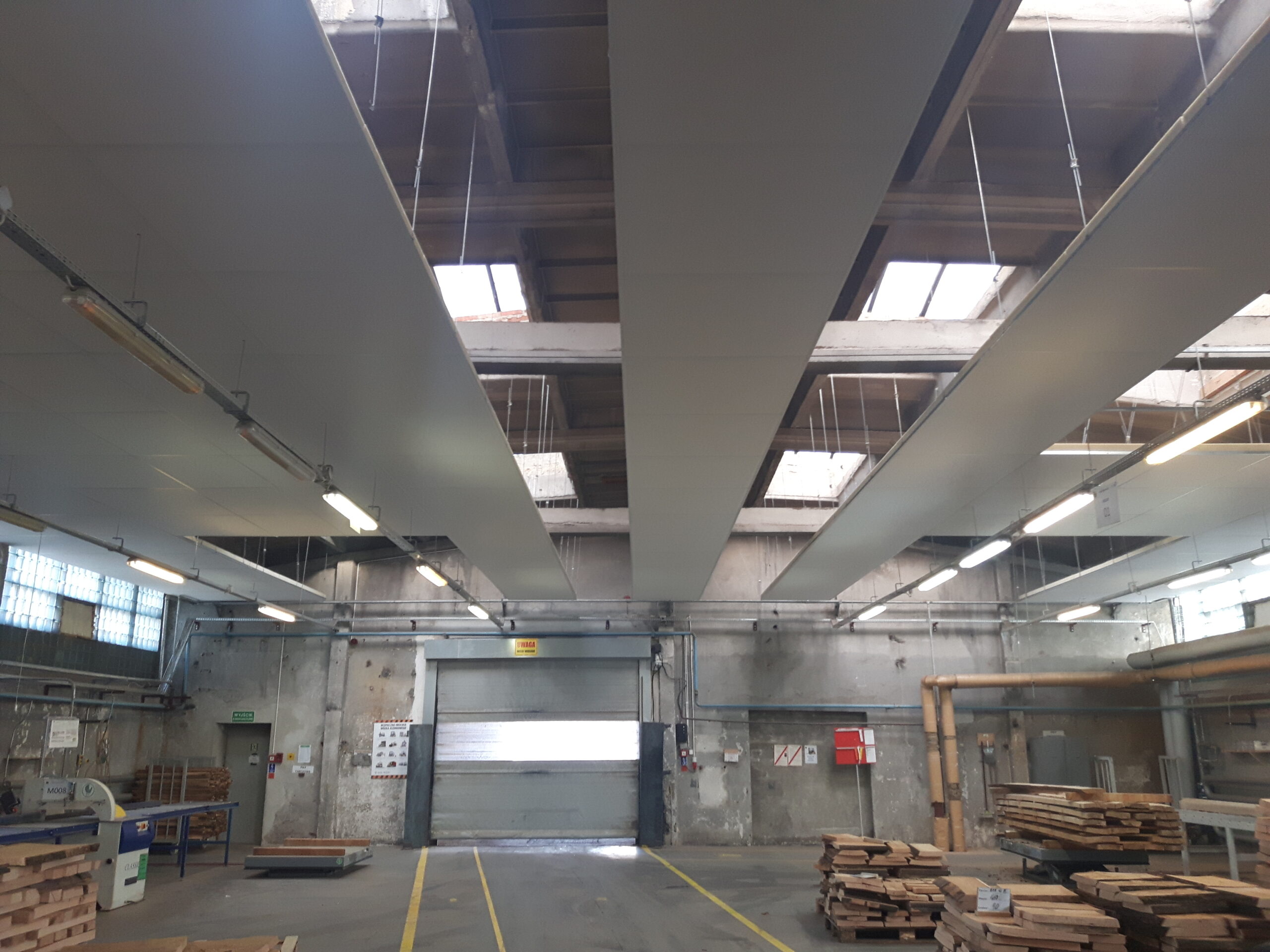 Dla firmy z branży meblarskiej ZEBRA Sp. z o.o. w Mieroszowie wykonaliśmy projekt akustyczny trzech hal produkcyjnych, jak również przedstawiliśmy wytyczne oraz wymagania w zakresie akustyki wnętrz. Na halach znajdują się linie produkcyjne, umieszczone równolegle do ścian bocznych. Maszyny wszystkich linii są ustawione wzdłuż hali, tworząc z niej obszar głównych źródeł hałasu. W celu obniżenia poziomu hałasu powstającego wewnątrz hal produkcyjnych jako głównym założeniem adaptacji akustycznej było wydzielenie część sufitu w postaci podwieszonych paneli dźwiękochłonnych o odpowiednim współczynniku pochłaniania dźwięku. Na stanowiskach operatorów maszyn lub urządzeń o poziomie ekspozycyjnym decydujący wpływ na hałas mają maszyny znajdujące się najbliżej stanowiska pracy. Należało zatem wyeliminować odbicia fali akustycznej od sufitu nad urządzeniami oraz obniżyć hałas pogłosowy za pomocą dodatkowych wariantów technicznych wyciszenia stanowisk pracy.